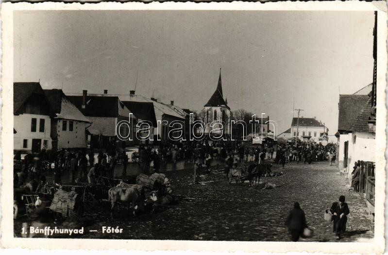 1941 Bánffyhunyad, Huedin; Fő tér, templom, piac / main square, church, market + "BESZTERCE - BUDAPEST 302 B" vasúti mozgóposta bélyegző (ragasztónyomok / glue marks)