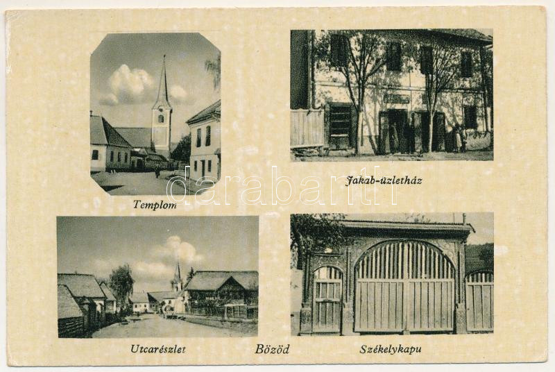 Bözödújfalu, Bezidu Nou; Templom, Jakab-üzletház, utcarészlet, Székelykapu / church, shops, street, Szekler gate (EB)