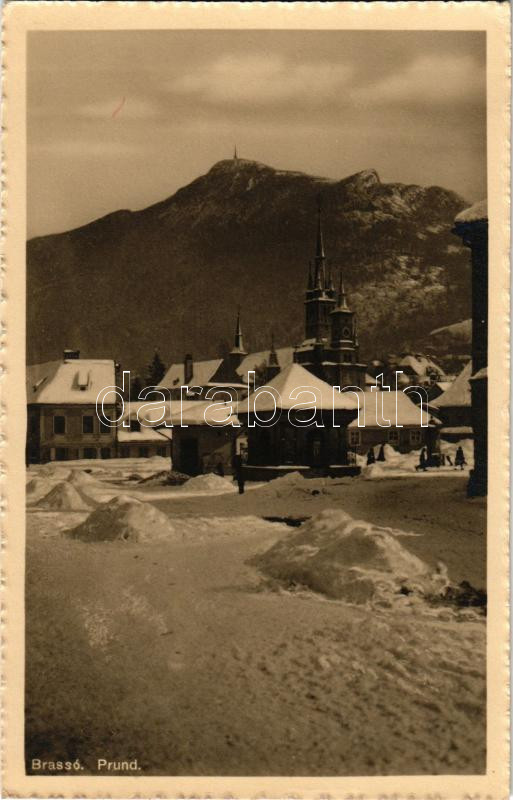 Brassó, Kronstadt, Brasov; Porond tér télen, üzlet, Szent Miklós ortodox templom. Zeidner H. kiadása / Prund, Piata Prundului / square in winter, shop, Orthodox church (EK)