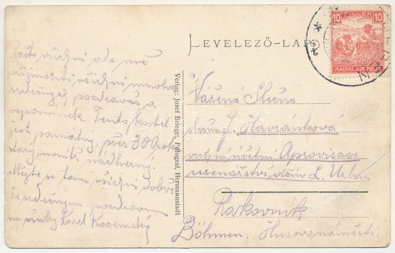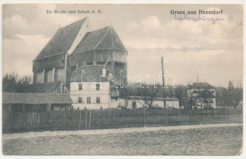 Hégen, Henndorf, Hendorf, Bradeni; Ev. Kirche und Schule A. B. Verlag Josef Briegel Fotograf / evangélikus templom és iskola / Lutheran church and school (EK)