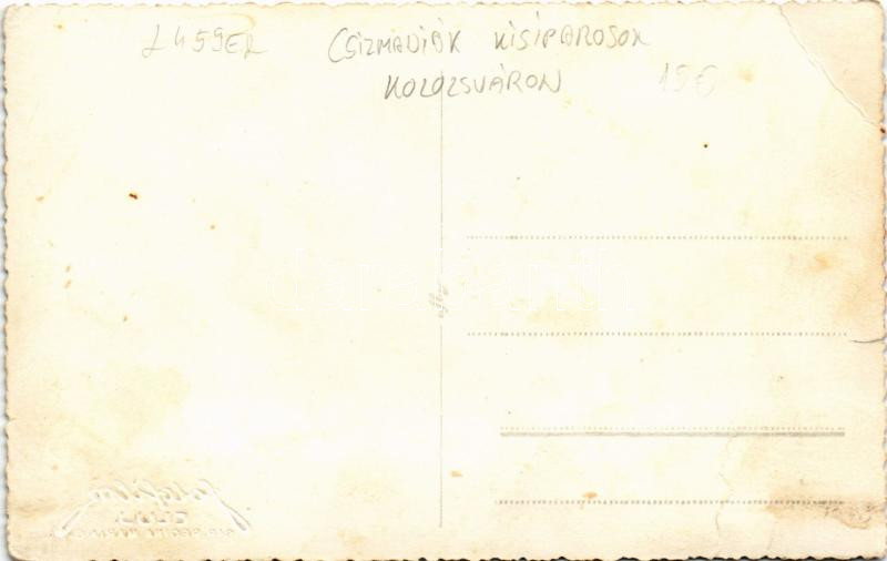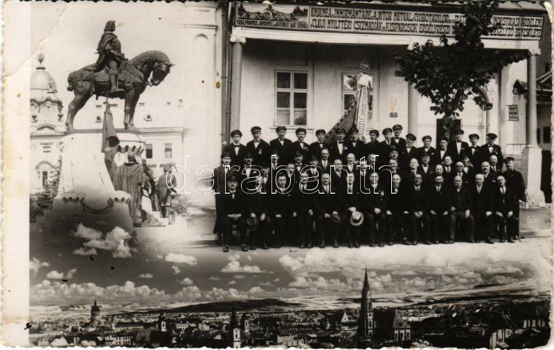 Kolozsvár, Cluj; Csizmadia kisiparosok csoportképe, szobor, látkép, montázs / shoemakers, montage photo with statue and view (EB)