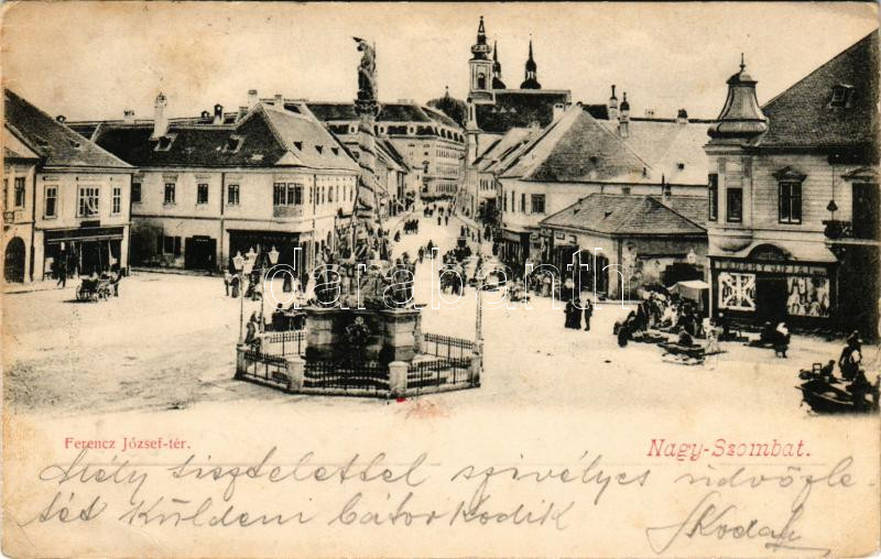 1905 Nagyszombat, Tyrnau, Trnava; Ferenc József tér, Szentháromság szobor, piac, üzletek / square, Holy Trinity statue, market, shops (fl)
