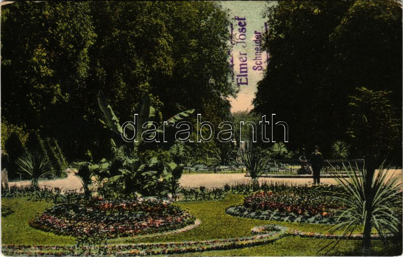 1910 Pozsony, Pressburg, Bratislava; Ligeti díszkert. Kaufmann's "Bediene dich allein" / Aupark / park + "Elmer Josef Schneider" (EK)