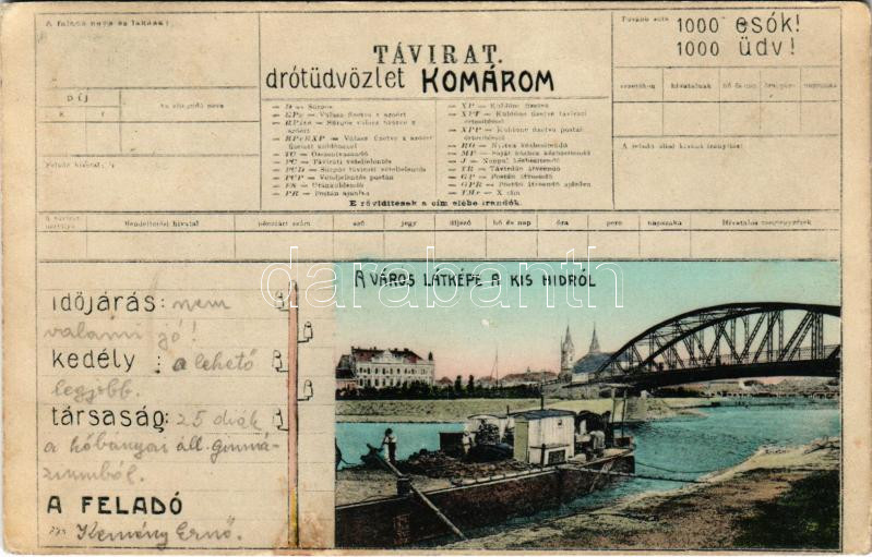 1912 Komárom, Komárno; A város látképe a kis hídról, uszály. Távirat drótüdvözlet montázs kitöltve a kőbányai állami gimnázium diákjai által. E.D.K. "Pannonia" / general view, bridge, barge. Montage with telegraph message (fl)