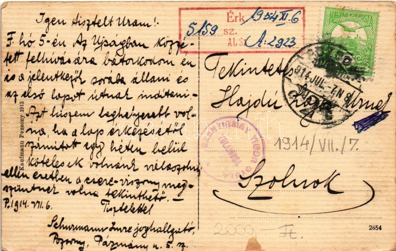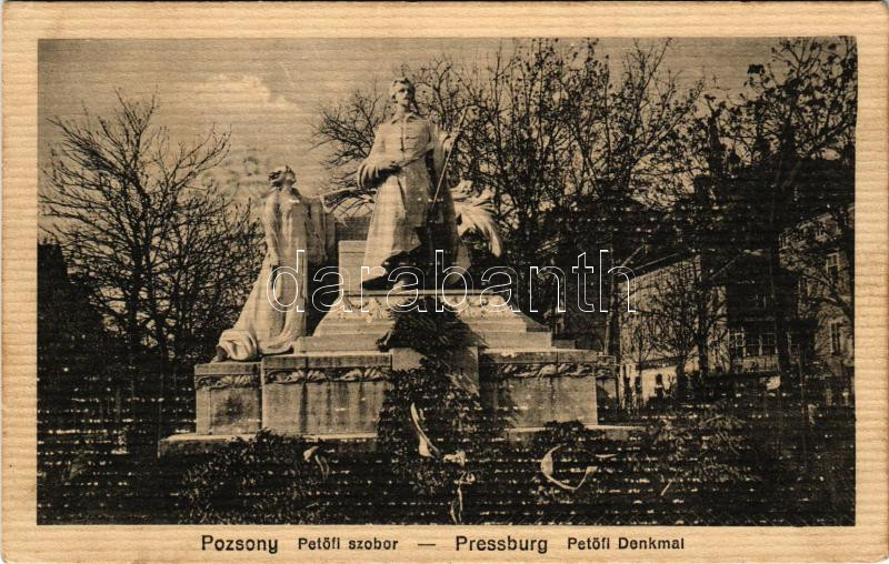 1914 Pozsony, Pressburg, Bratislava; Petőfi szobor. Kaufmann kiadása / Denkmal / statue + "Szentirmay Tibor Gyula tulajdonos" pecsétje a hátoldalon