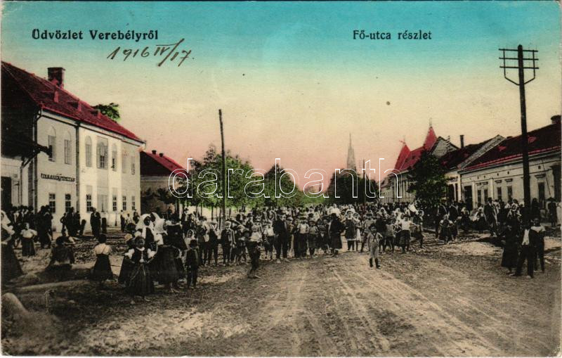 1916 Verebély, Vráble; Fő utca, Takarékpénztár, üzletek. Hungária könyvnyomda kiadása / main street, savings bank, shops (EK)