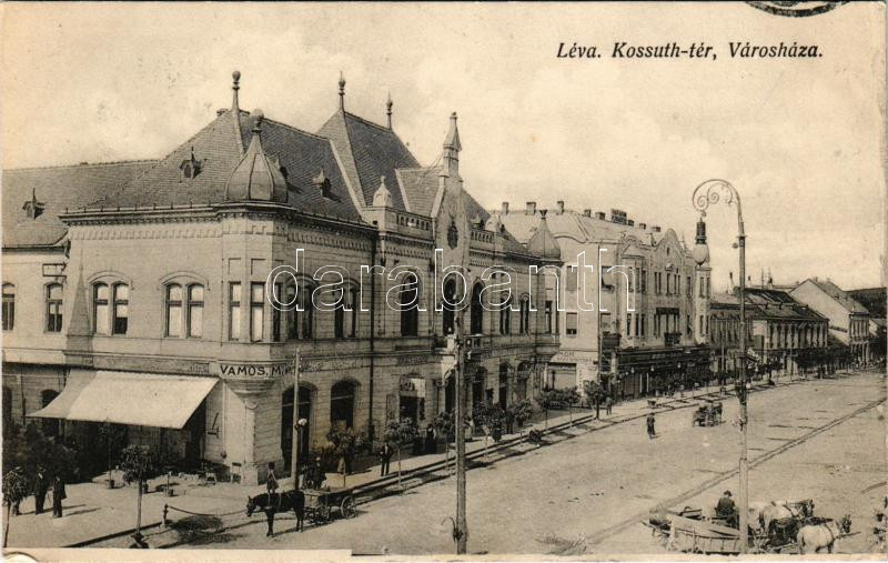 1917 Léva, Levice; Kossuth tér, városháza, piac, Vámos M., Kovács Sándor üzlete. Schulcz Ignác kiadása / square, town hall, market, shops (EK)