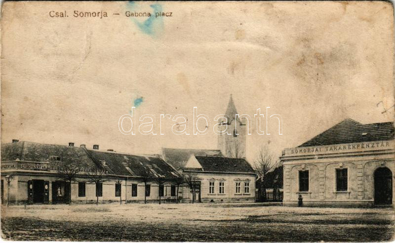 1917 Somorja, Csallóköz-Somorja, Somorin, Samorín; Gabona piac, Somorjai Takarékpénztár, gyógyszertár, templom. Kranzinger Nándor kiadása / market square, savings bank, pharmacy, church (Rb)