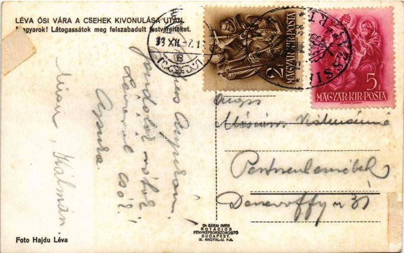 1938 Léva, Levice; Léva ősi vára a csehek kivonulása után "Magyarok! Látogassátok meg felszabadult testvéreiteket!" bevonulás / castle after the withdrawal of the Czechs, entry of the Hungarian troops + "1938 Léva visszatért" So. Stpl. (ragasztónyom / glue marks)
