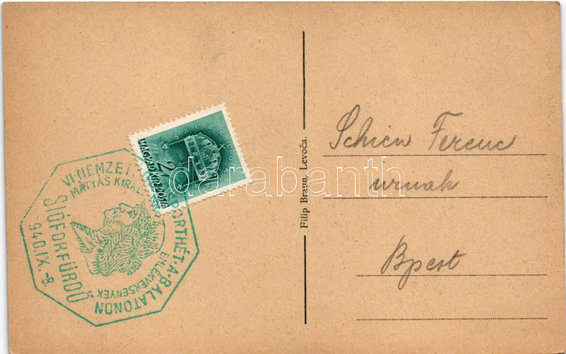 Lőcse, Levoca; Evanj. kostol / Evangélikus templom. Filip Braun kiadása / Lutheran church + "VI. Nemzetközi Sporthét a Balatonon Mátyás király emlékversenyek Siófokfürdő 1940. IX. 8." So. Stpl. (EK)