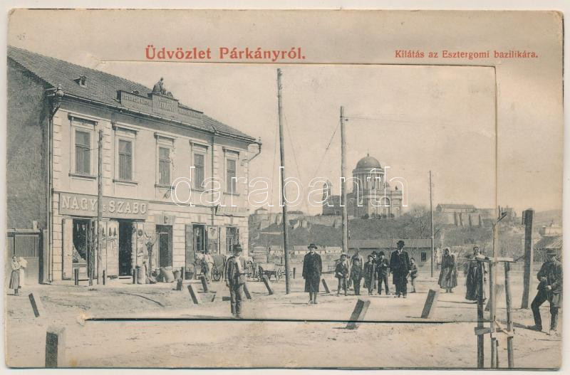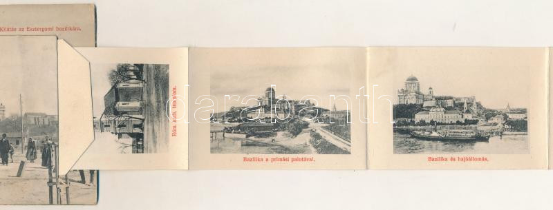 Párkány, Parkan, Stúrovo; kilátás az esztergomi bazilikára, Nagy és Szabó, Steiner Mór üzlete. Preis Rezső kiadása, leporellólap 10 képpel, közte vasútállomás (a füzetke már nincs rögzülve, kijön) / basilica, shops. leporellocard with 10 pictures, including the railway station (b)