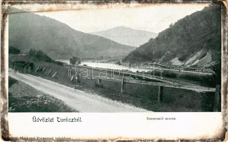 Sztrecsnó, Sztrecsény, Strecno (Trencsén); Üdvözlet Turóczból. Sztrecsnói-szoros. Moskóczi Ferencné kiadása / Povazie / gorge in the Váh valley (kopott sarkak / worn corners)
