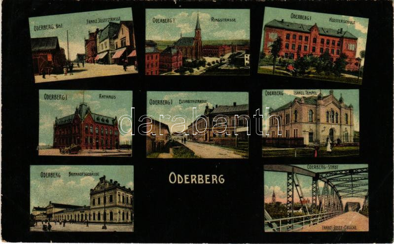1911 Bohumín, Bogumin, Oderberg; Franz Josefstrasse, Ringstrasse, Klosterschule, Rathaus, Elisabethstrasse, Israel. Tempel, Bahnhofsgebäude, Franz Josef-Brücke. Verlag O. Müller / streets, boarding school, town hall, synagogue, railway station, bridge (EB)