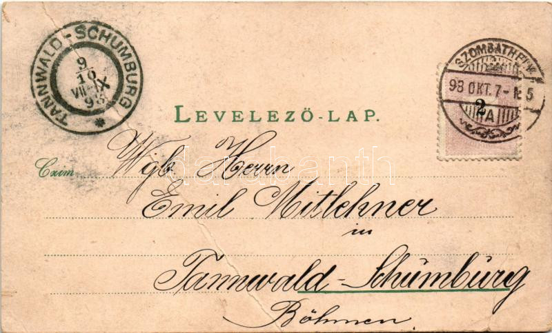 1898 Szombathely, látkép, Székesegyház, Széll Kálmán utca, zsinagóga. Apfel Art Nouveau, floral, litho (fa)