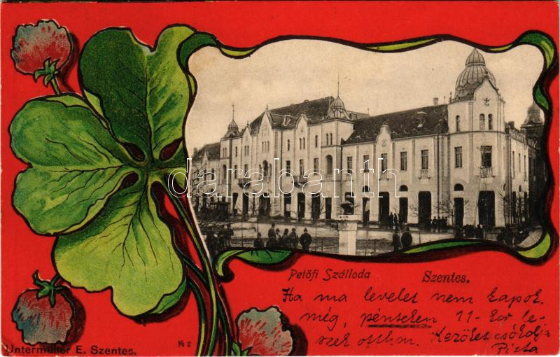 1902 Szentes, Petőfi szálloda. Untermüller E. kiadása, szecessziós litho keret lóherével / Art Nouveau, litho frame with clover (EK)