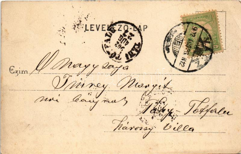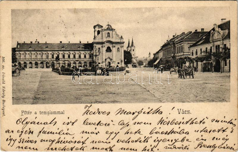 1902 Vác, Fő tér a templommal, üzletek. Kiadja Divald Károly 166. sz. (EK)