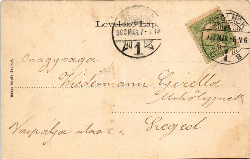 1903 Szolnok, Piactér, üzletek, vasúti vashíd. Bakos István kiadása, szecessziós litho keret / Art Nouveau, litho frame (fl)