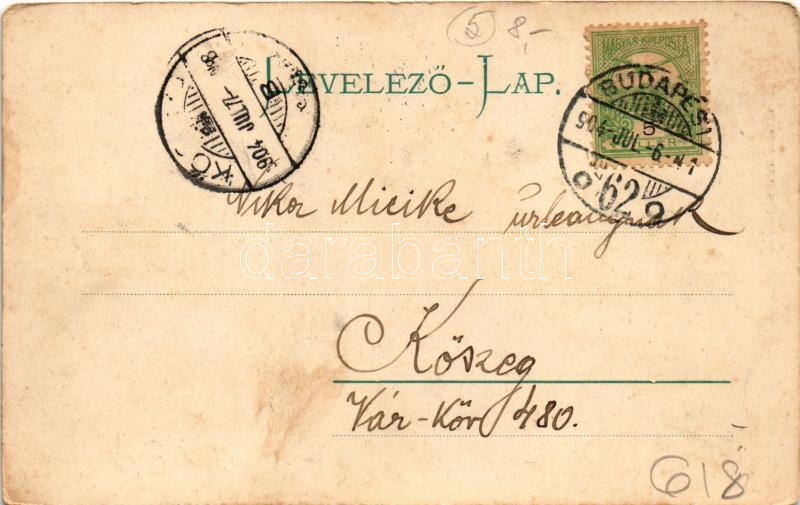 1904 Nagymaros, látkép, Zoller József üzlete, csemege osztály az udvarban. Zoller József saját kiadása, szecessziós-virágos keret (fl)