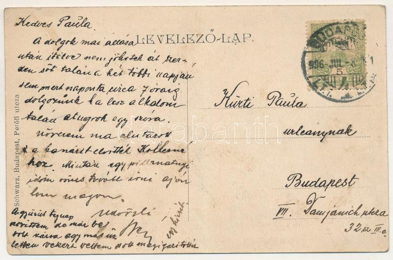 1906 Budapest II. Margit körút, villamos, üzletek, Pesti hengermalmi liszt és hüvelyes vetemények, Frank Károly üzlete. J. Schwarz kiadása (fa)