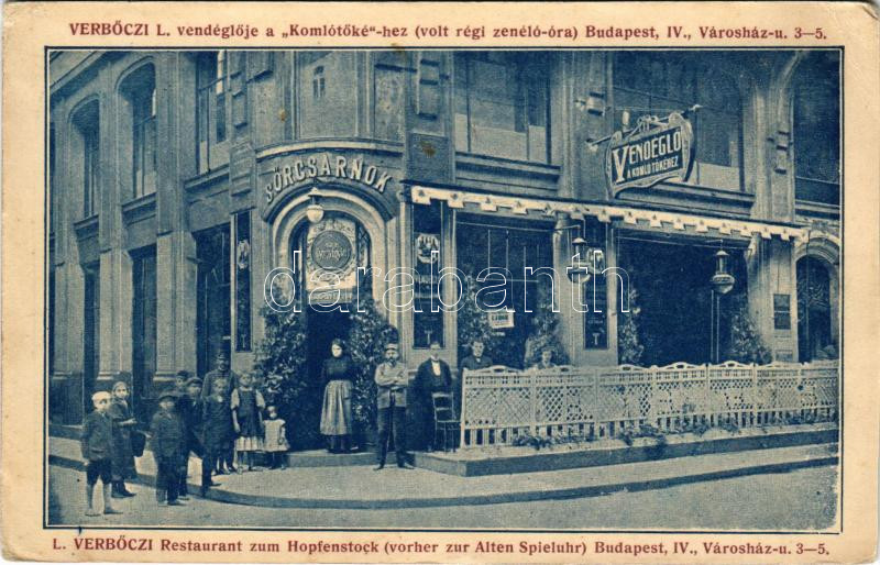 1911 Budapest V. Verbőczi L. vendéglője a Komlótőkéhez (volt régi zenélő óra) Városház utca 3-5. (vágott / cut)