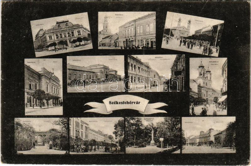 1915 Székesfehérvár, Igazságügyi palota, Kossuth utca, Rákóczi utca, Izraelita templom, zsinagóga, színház, vasútállomás, Nádor utca, Zichy liget, Vörösmarty tér, Vértanúk szobra, Széchenyi utca (ázott / wet damage)