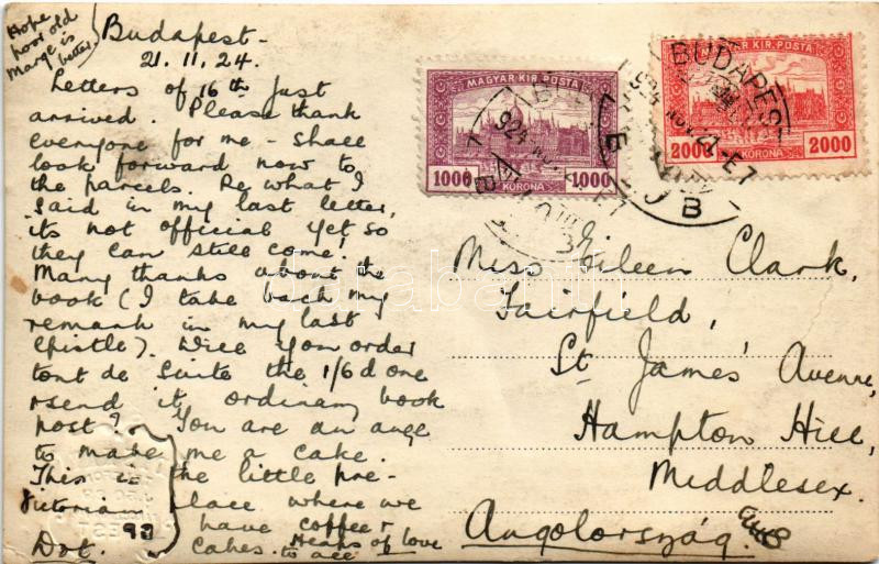 A képeslapon a cukrászda 1924-es formája látható: az ablakot és a bejáratot a maitól eltérÅ‘en egy elÅ‘térré, kirakattá alakÃtották, üvegszekrényében cukorkakÃnálók és asztaldÃszek gyűjteménye kapott helyett. A képeslapra Ãrt üzenet angol nyelvű szövegében a következÅ‘ olvasható: "Ez az a picike Viktória elÅ‘tti idÅ‘bÅ‘l származó hely, ahol kávét ittunk."