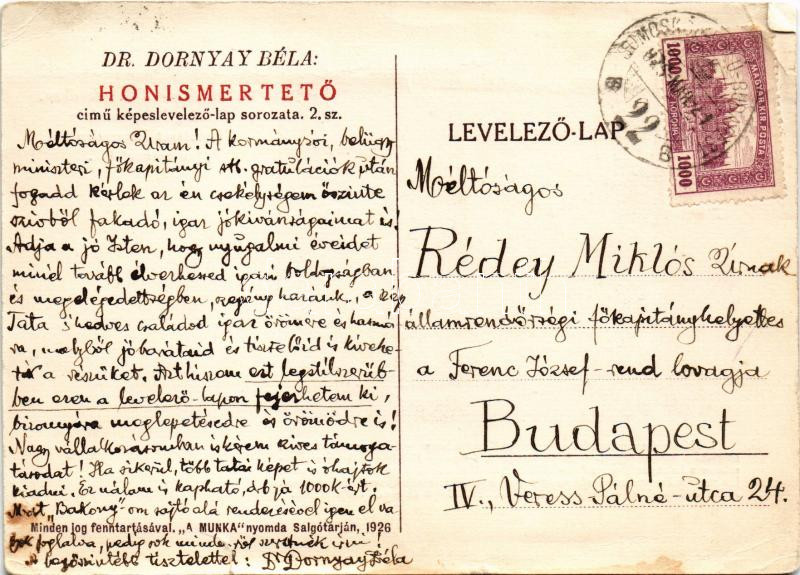 1926 Tata, Tata-Tóváros; Tata vára a XVI. században. Streibing-Nitsmann-féle fametszet ismeretlen "Jaurinense"-ből. Dr. Dornyay Béla "Honismertető" című képeslevelezőlap sorozata 2. sz. A képeslap feladója maga a kiadó, Dr Dornyay Béla (1887-1965) muzeológus, címzettje Rédey Miklós (1886-1931) államrendőrségi fő- és székvárosi kerületi kapitányhelyettes + "SOMOSKŐÚJFALU - BUDAPEST 22 B" vasúti mozgóposta bélyegző (szakadás / tear)