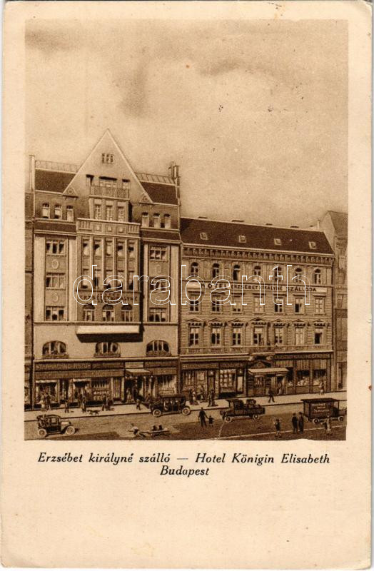 1929 Budapest V. Erzsébet királyné szálloda és kávéház reklámja, automobilok, Szabó Imre tulajdonos. Egyetem utca 5-7. (EK)