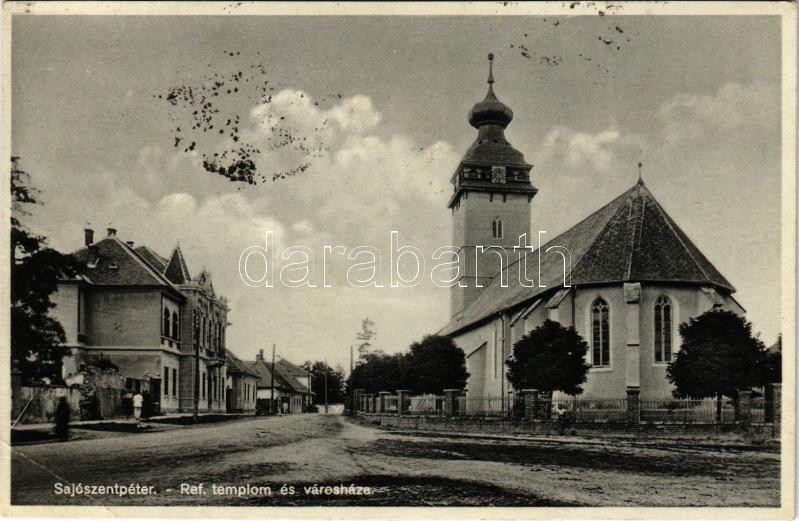 1937 Sajószentpéter, Református templom és városháza. Frank Jenő kiadása (EB)
