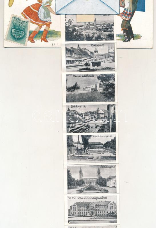 1941 Pécs, magyar népviseletes leporellólap 10 kis képpel és repülőgéppel (fa)