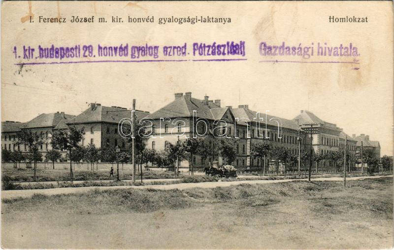 Budapest IX. Ferenc József m. kir. honvéd gyalogsági laktanya, homlokzat. Schäffer Ármin kiadása + "M. kir. budapesti 29. honvéd gyalog ezred Pótzászlóalj Gazdasági hivatala" (gyűrődések / creases)