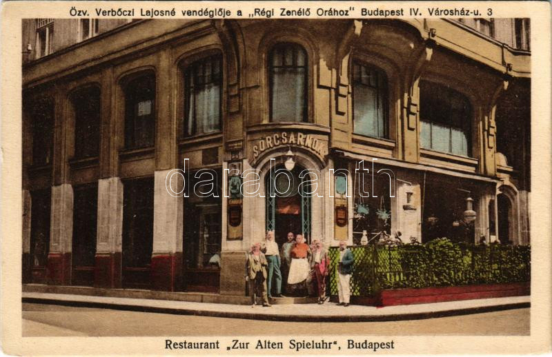 Budapest V. Özv. Verbőczi Lajosné vendéglője a "Régi Zenélő Órához", sörcsarnok. Városház utca 3. / Restaurant "Zur Alten Spieluhr"