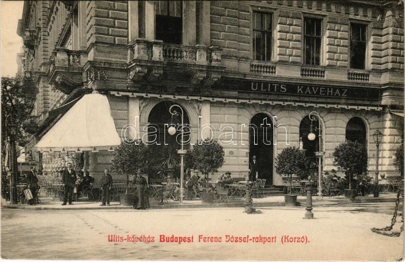 Budapest V. Ulits kávéház, terasz vendégekkel és pincérekkel. Ferenc József rakpart (Korzó)