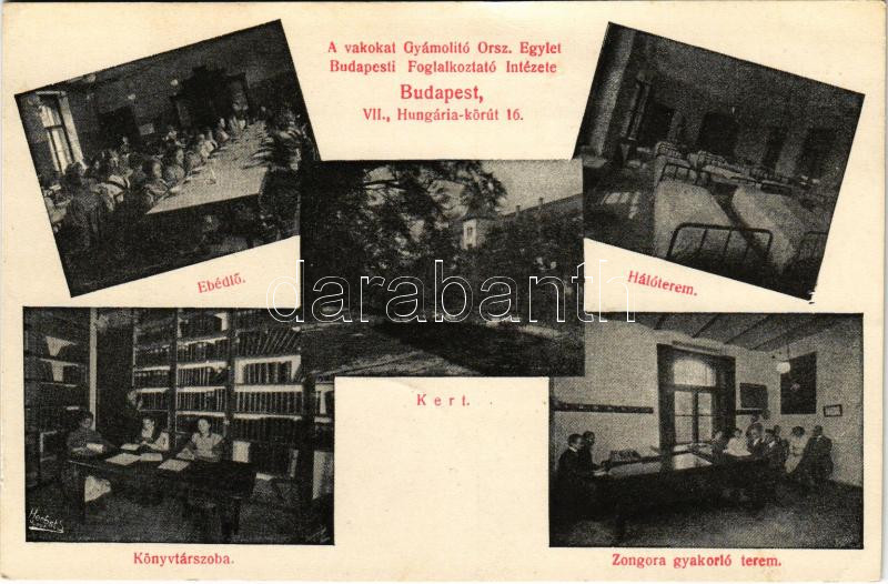 Budapest VIII. Vakokat Gyámolító Országos Egylet Budapesti Foglalkoztató Intézete. Ebédlő, hálóterem, könyvtárszoba, zongora gyakorlóterem, kert. Hungária körút 16. Hátoldalon adománygyűjtés (EK)
