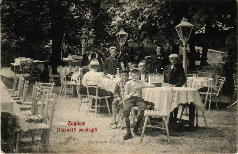 Budapest XII. Zugliget, Disznófő vendéglő, étterem kerthelyisége, pincérekkel és vendégekkel (gyűrődés / crease)