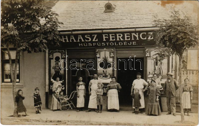 Budapest XXII. (?) Haasz Ferenc húsfüstöldéje, hentes üzlet, előtte a személyzet. photo (fl)