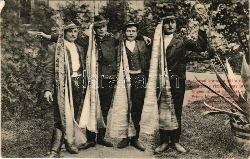 Csorna, Vizitáló nagyurak a Korona vendéglőbe, népviselet. Hátoldalon sorsjegy a Csornai Járási Közkórház javára. Divald Károly fénynyomdai műintézetéből (EB)