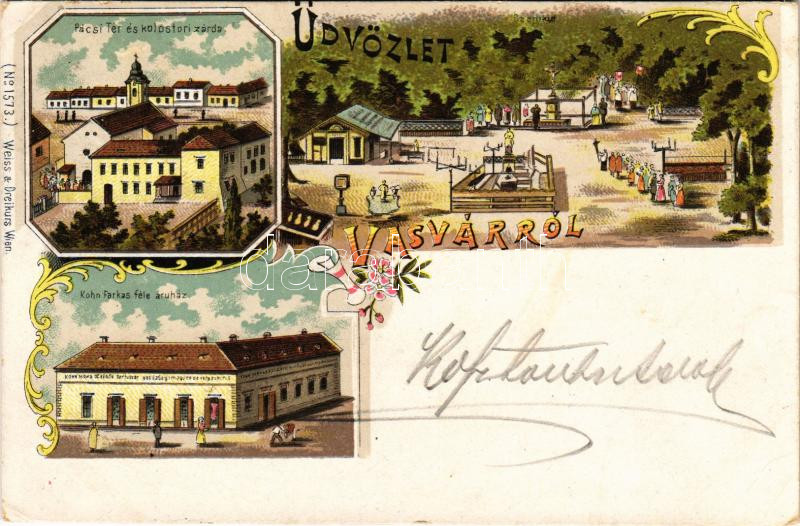Vasvár, Pácsi tér és kolostori zárda, Kohn Farkas féle áruház. Weiss & Dreikurs Wien No. 1573. Art Nouveau, floral, litho (Rb)