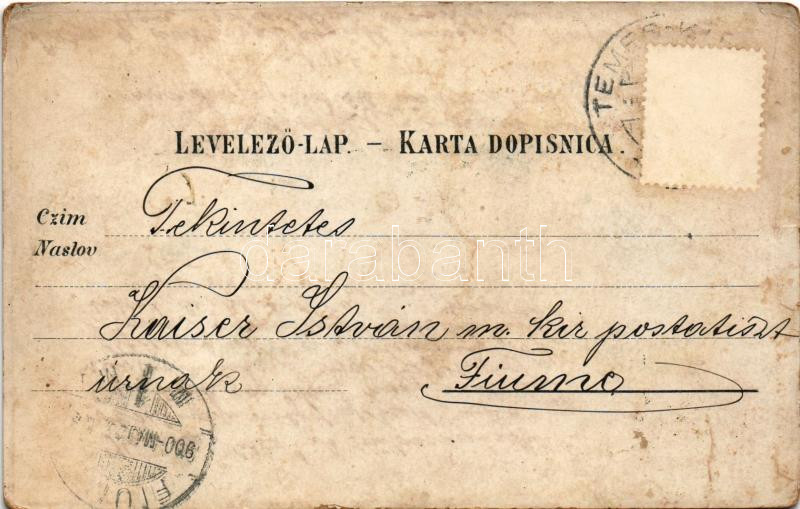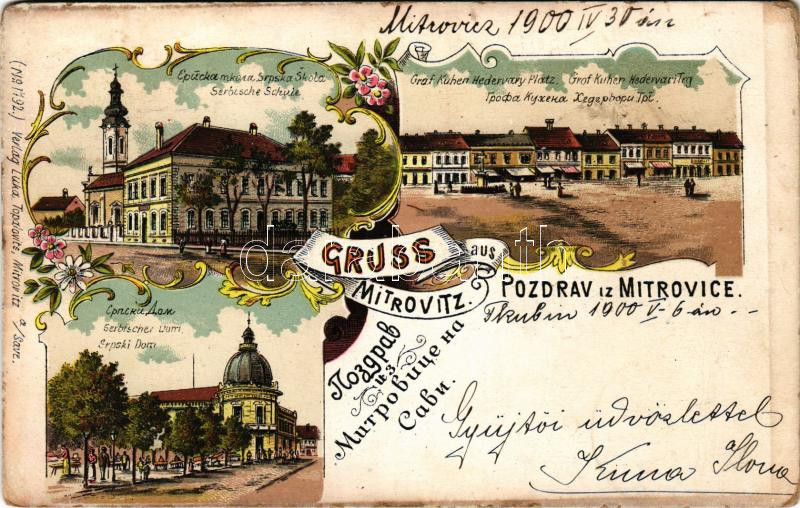 1900 Szávaszentdemeter, Mitrovice, Mitrovitz an der Save, Sremska Mitrovica; Serbische Schule, Graf Khuen Hedervary Platz / Szerb iskola, Gróf Khuen-Héderváry tér, Szerb ház. Szecessziós-virágos litho / Serbian school, square, shops, Serbian National House. Art Nouveau, floral, litho (fl)