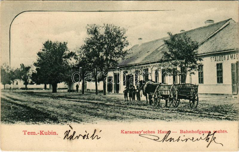 1903 Kevevára, Temeskubin, Kovin; Karacsay'sches Haus, Bahnhofgasse rechts / Vasút utca, Karacsay ház, szálloda / street view, hotel