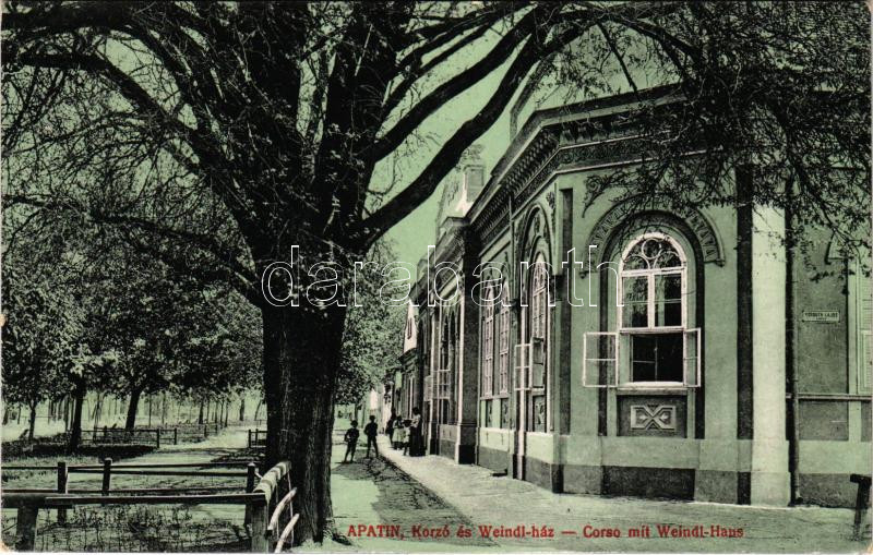 Apatin, Korzó és Weindl-ház, Kossuth Lajos utca. Gasz M. kiadása / Corso mit Weindl-Haus / street view, Weindl House (fl)
