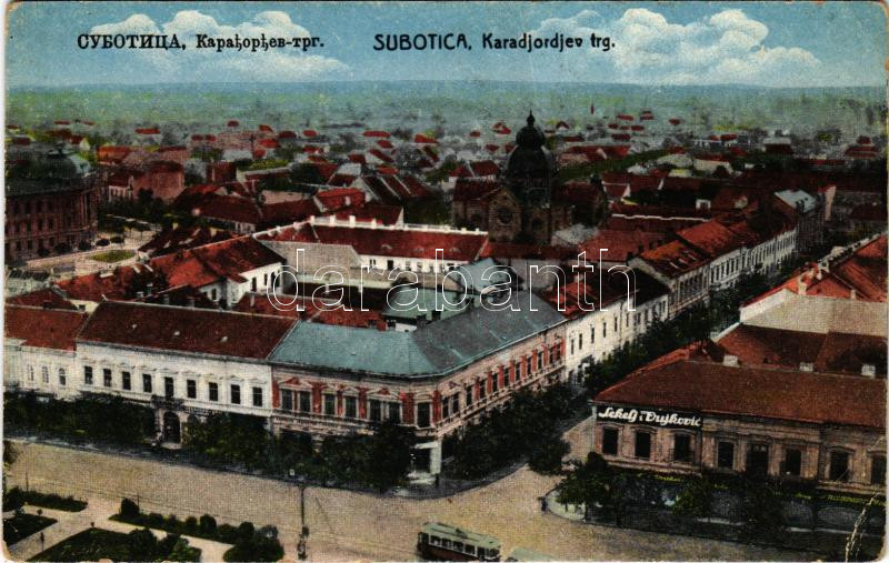 Szabadka, Subotica; Karadjordjev trg / látkép, villamos, zsinagóga, üzletek / general view, tram, synagogue, shops (EB)