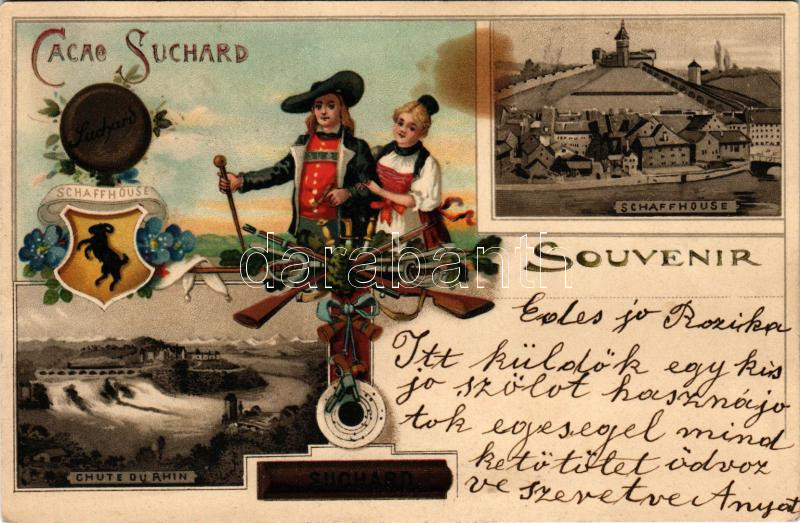 Cacao Suchard Swiss chocolate advertisement with Schaffhausen, Switzerland. Art Nouveau, floral, litho with coat of arms (fl)