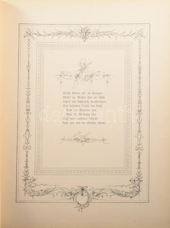 Friedrich von Schiller: Das Lied von der Glocke; von - -. Illustriert in 17 Compositionen von Alexander von Liezen Mayer. Mit Ornamenten von Ludwig van Kramer. München, én., Theodor Stroefer's Kunstverlag, 18 sztl. lev. +6 t. Fünfte Auflage. Német nyelven. Gazdag fekete-fehér képanyaggal, és egészoldalas táblákkal illusztrált. Kiadói illusztrált egészvászon-kötés, aranyozott lapélekkel, kissé kopott borítóval, kissé sérült gerinccel, 37x28 cm.