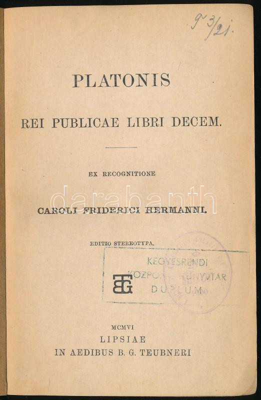 Platonis rei publicae libri decem. Ex recognitione Caroli Friderici Hermanni. Lipsiae, 1906, in Aedibus B. G. Teubneri. Kiadói egészvászon kötés, kopottas állapotban.