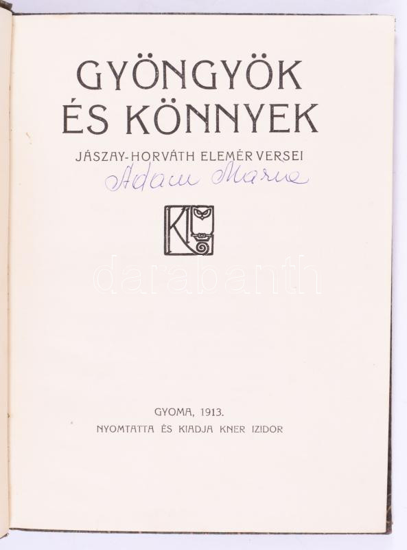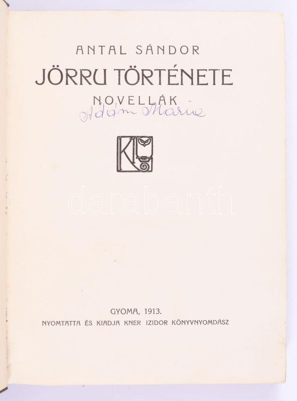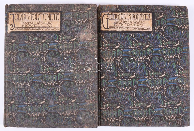 2 db dekoratív Kner kiadvány: Antal Sándor: Jörru története. Novellák. Gyoma, 1913, Kner. Kiadói egészvászon kötés, + - Jászay-Horváth Elemér: Gyöngyök és könnyek. Gyoma 1913. Kner Izidor. Verses kötet. Festett egészvászon kötés, kis kopással