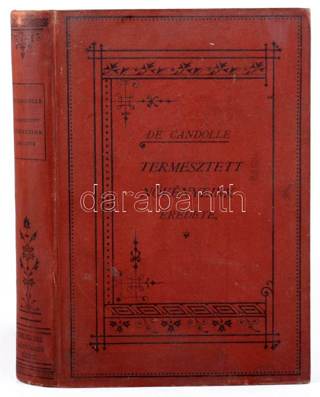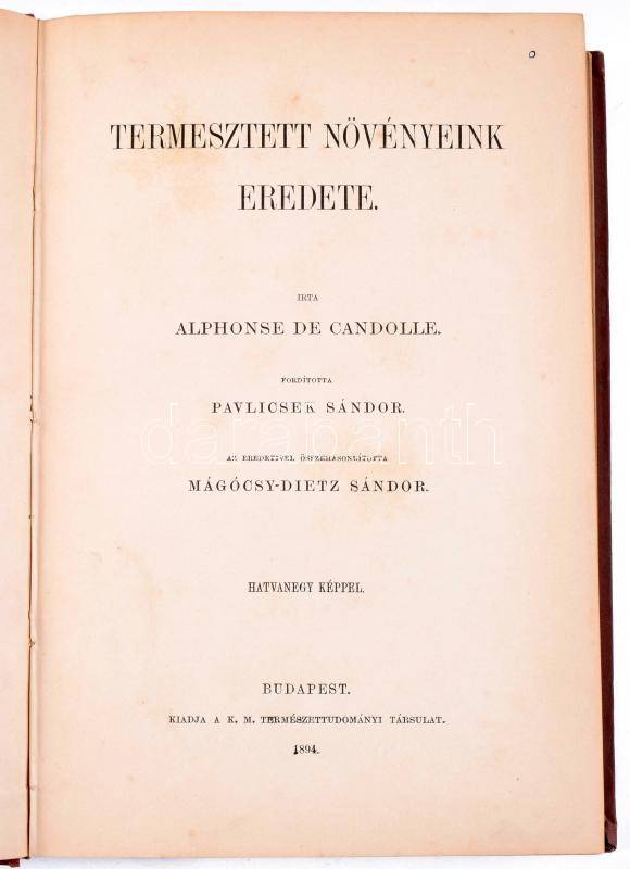 Alphonse de Candolle: Termesztett növényeink eredete. Ford.: Pavlicsek Sándor. Természettudományi Könyvkiadó-Vállalat LII. kötet. Bp., 1894, Kir. M. Természettudományi Társulat, XV+515+1 p. Kiadói aranyozott egészvászon-kötés, Molnár Mihály-kötés, kis kopással