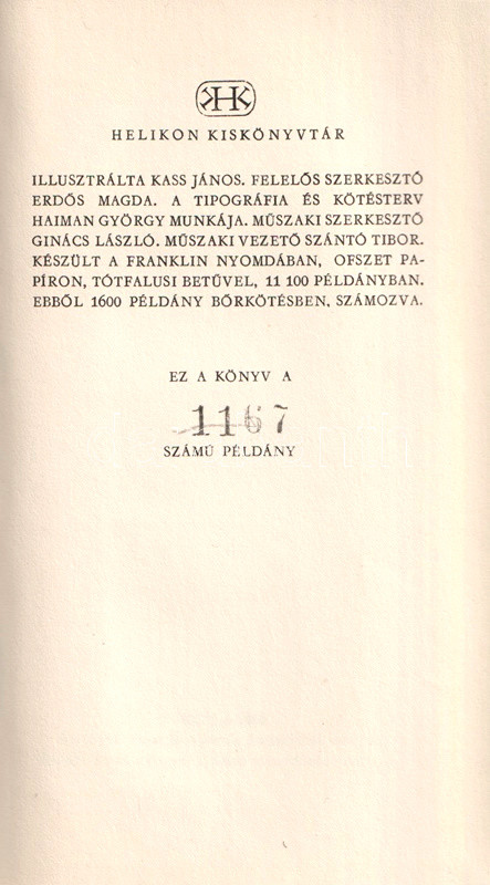 Könyvgyűjtők számára készült, számozott, bibliofil kiadás. Kolofon: "Illusztrálta Kass János. Felelős szerkesztő Erdős Magda. A tipográfia és kötésterv Haiman György munkája. Műszaki szerkesztő Ginács László. Műszaki vezető Szántó Tibor. Készült a Franklin Nyomdában, Tótfalusi betűvel, 11,100 példányban. Ebből 1600 példány bőrkötésben, számozva. Ez a könyv a[z] 1167. számú példány."