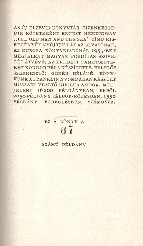 Könyvgyűjtők számára készült, számozott, bibliofil kiadás. Kolofon: "Az Új Elzevir könyvtár tizenkettedik köteteként Ernest Hemingway "The Old Man and the Sea" című kisregényét nyújtjuk át az olvasónak, az Európa Könyvkiadónál 1959-ben megjelent magyar fordítás szövegét átvéve. Az eredeti fametszeteket Kondor Béla készítette. Felelős szerkesztő: Geréb Béláné. Műszaki vezető: Kugler Andor. Megjelent 16,200 példányban, ebből 2050 példány félbőr-kötésben, 1550 példány bőrkötésben, számozva. Ez a könyv a 67. számú példány".