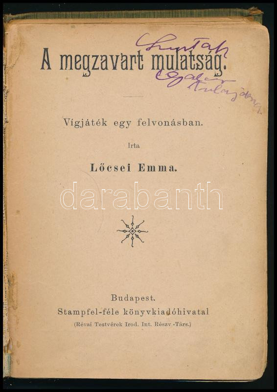Ifjúsági Színház kolligátum, 7 mű egy kötetben: Lőcsei Emma: A megzavart mulatság.; Gaal Mózes: Luca-napján.; A majálisi elnök.; A kegyenc.; A javíthatatlan.; Lőcsei Emma: A rokon.; Jó szív. Bp., é.n. (cca 1900), Stampfel. Egészvászon-kötésben, kissé viseltes állapotban, helyenként kissé sérült, a fűzéstől elváló lapokkal, egy-két kijáró lappal.